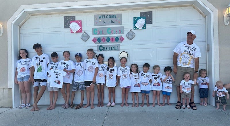 I love my family. Each year my wife organizes a Cousins Camp. It’s a week-long event. Most of our grandchildren are able to come. This picture is of July of 2024, we had 16 present and one who couldn’t make it. The theme was the Cool Cousins Cooking Challenge and my wife helped each of our grandchildren, individually, make their chosen recipe. I spent my time outside with the grandchildren playing in the water, reading books, and just having fun.